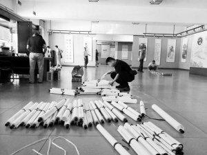 8月3日10时许,乌鲁木齐美术馆内一片忙碌的景象,来自乌鲁木齐、周口两地的书画家都在紧张地布展。按照书画作品的种类、风格、尺寸等的不同,他们将书画作品挑选、分类、排序后,悬挂到展厅适当的位置。对他们来说,每一处细节,都可能影响到展出的效果和观众的视觉舒适度。两个小时后,来自两地书画家的200余幅书画精品已妥帖地挂到了美术馆两层展厅的墙上。