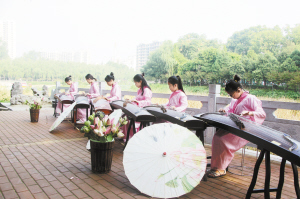 快闪演出首先是朗诵《爱莲说》。每个小学员手持莲花、身着粉红色汉服款款而行,就像一个个荷花仙子。花艺表演之后是古筝演奏(如图),古筝小学员有模有样的演奏,使晨练的人们大开眼界。作为中国传统音乐文化,古筝演奏深受周口人欢迎,在周口已掀起一阵古筝文化热。