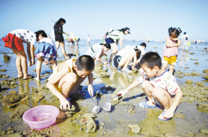 当日,海南省琼海市潭门湾举行一年一度的赶海节,吸引了众多游客来到海边拾贝抓蟹,体验赶海。新华社记者 郭程 摄