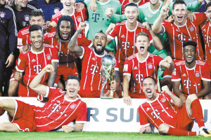 当地时间8月5日,拜仁慕尼黑队球员在比赛后的颁奖仪式上与冠军奖杯合影。当日,在德国多特蒙德举行的2017年德国超级杯比赛中,拜仁慕尼黑队与多特蒙德队在常规时间内战成2∶2平。点球大战中,拜仁慕尼黑队以5∶4的战胜多特蒙德队,夺得冠军。新华社发
