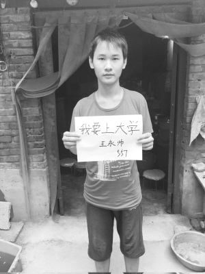 王永帅是商水县城关乡人。虽然住在县城,但王永帅家的居住条件却无法与周围的邻居相比。王永帅今年考了557分,被中国矿业大学录取。他的哥哥目前在武汉大学上大三。一家出了两个名牌大学生,让王永帅家在当地小有名气。“我的腿脚不方便,很多活不能干,打工也挣不了多少钱。我的妻子在县城打工,月工资1000多元。我和妻子没有学问,对两个儿子的学习关心得很少,也不知道怎么关心,全靠他们自己。”王永帅的父亲说。