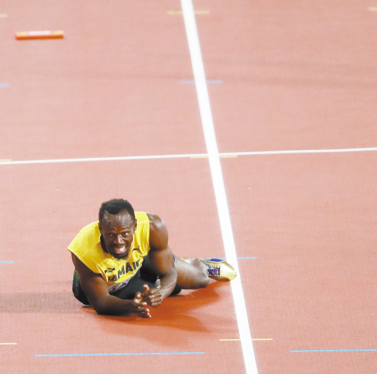 世锦赛男子4×100米接力赛 博尔特谢幕战伤退 “闪电”博尔特倒在赛道上 据新华社电 “遗憾”,成为当地时间8月12日伦敦田径世锦赛的主题词。八枚奥运金牌得主博尔特在最后一战中受伤,辉煌生涯就此落幕。受到意外影响的中国男队在4×100米接力决赛中位列第四。 男子4×100米接力决赛是当晚压轴大戏,这是牙买加“闪电”博尔特的生涯谢幕之战。然而担任最