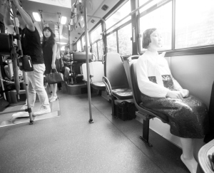 8月14日,在韩国首尔,人们乘坐载有“慰安妇”少女像的151路公交车。