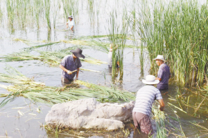 本报讯 周口公园是市民休闲娱乐的好去处,但近段时间公园湖面上疯长的水草却大煞风景。据了解,去年,由于军舰挪移需要,不得不将公园如意湖湖水抽干,加之今年气温较高,光照充足,如意湖内菖蒲、芦苇等水草长势迅猛,不但影响湖面的观光效果,也破坏了如意湖的生态环境。为了让湖水重返清澈,连日来,市园林处组织30名园林工人水中作业清捞水草(如图),确保湖水清洁,生态平衡。