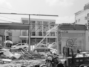 育新路与六一路交叉口西北角的10多间门面房,屋内已经清空,工人正在拆除门头等附属物;交叉口东北角的市直幼儿园门口的几间“两违”建筑也在拆除中。