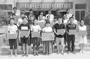 8月15日上午,市妇联携手女企业家韩平女士对我市17名贫困大学新生发放了爱心助学款。在发放现场,17名学子接受了韩平女士共计8.5万元的爱心助学款,每人5000元。晚报记者 王凯 摄