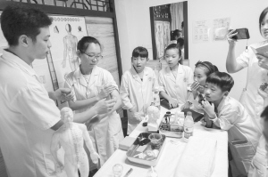 8月15日,在浙江省温州市中心医院,医生为“小医师”讲解如何拔罐。