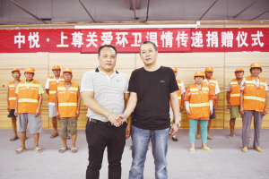 本报讯 8月14日下午,中悦·上尊营销中心三楼举行了“关爱环卫,温情传递”爱心捐赠仪式,向川汇区环卫工人代表赠送了2300套安全反光背心。川汇区爱卫办副主任张大鹏代表川汇区环卫工人向中悦·上尊表示感谢(如图)。