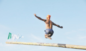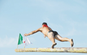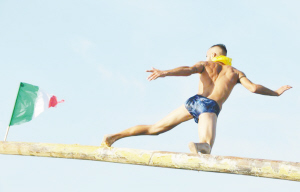 日前,意大利那不勒斯,民众为庆祝圣母升天举行“肥皂木杆”比赛,参赛者需站在木杆上取得木杆末端的三支旗,然而在木杆末端涂满肥皂十分光滑。