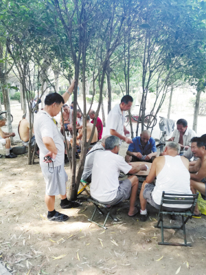 8月21日9时许,周口晚报记者在周口人民公园看到,一些老人或蹲或坐,正聚在一起玩扑克(如图),不时有老人因为赢牌而发出胜利的笑声。