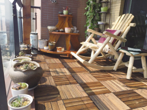 在瓷砖上铺贴户外木地板,就可以避免瓷砖的诸多缺点。户外木材质经得起日晒雨淋,不需要过分打理。户外木地板的木条与木条之间有间隙,地板底下还有垫高层,方便水流,不容易积水。木色的地面,即使有灰尘看起来也并不显眼,只需用水一冲,就能打理干净。另外,户外木的自然木色,更能凸显绿植的美,让阳台的整体性更强。