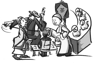 “脚行班”(搬运工人)是茶馆的常客。冬天,为了取暖,他们晚上总是到茶馆里算账,一些单身汉趁着分钱的机会,买些杂面和好在茶炉上炕饼子吃,随后在茶馆里取暖过夜。夏天是卖“零茶”的好季节,茶馆老板摆出一张大方桌,上面倒上十来碗沙果叶茶,谁喝谁端,每碗1分钱。
