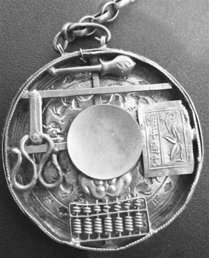 我收藏了一只清代银质抓周盘,其直径5.8厘米,边厚0.3厘米,重14.5克。从正面看,该盘正中央为一面内凹的圆镜,左右两侧各为剪刀和一本“万年通书”。圆镜的上方,分别为盒装盘秤与一把老式直尺;下方的算盘小巧别致,连每一颗珠子都可拨动。所有物件均具体而微小,且都是用焊接的方法经过精心布局排列,一目了然。从反面看,正中央为太极八卦图案,周围则依次为鼠、牛、虎、兔等十二生肖动物立体图,在它们的外围,分别对应着子、丑、寅、卯等十二地支的阳文汉字,间距得当,工整清晰。端详整件抓周盘,可见其工艺精美,包浆浑厚细腻,光线下依然银光灿灿,令人称奇。