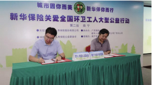 新华保险关爱全国环卫工人大型公益行动由新华保险通过其发起设立的新华人寿保险公益基金会这一专业公益平台实施。2017年度,新华保险将为包括南宁在内的全国20个大中城市的近20万名环卫工每人捐赠10万元保额的意外伤害保险,今年捐赠的意外险总保额近200亿元。