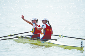 8月30日,河南队选手吕扬/王飞(右)在比赛后向观众致意。当日,在天津举行的第十三届全运会赛艇项目女子双人双桨决赛中,河南队选手吕扬/王飞以6分48秒45的成绩夺得冠军。 新华社记者 鞠焕宗 摄