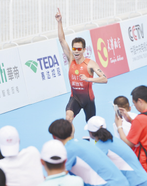 9月4日,解放军队选手白发全在比赛中冲向终点。当日,在第十三届全运会铁人三项混合接力赛决赛中,解放军队以1小时22分57秒167的成绩夺得金牌,河北队和山东队分获亚军和季军。新华社记者 李贺 摄