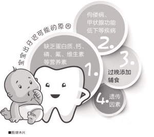 总之,造成宝宝出牙晚的原因是多方面的,家长在见到宝宝迟迟不出牙时,不能凭感觉就认为是缺钙而擅自给宝宝补钙或吃鱼肝油。应交给专业的医生判断,并在医生的指导下给予纠正,以真正达到改善出牙的目的。(林恒华)