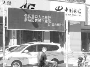 据悉,随着“五城联创”工作的有力推进,川汇区七一路办事处从多方面入手,发动市民广泛参与。对此,不少商户非常支持,纷纷在自家店铺门前的电子显示屏上打上宣传标语。这些店铺主要集中在七一路和文明路沿线,约有30余家。 晚报记者 朱东一 摄