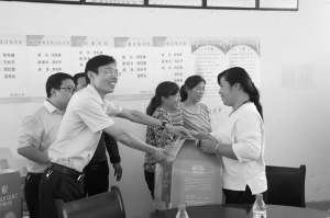 西华县红花镇杜岗村是市纪委的定点扶贫村。9月8日上午,市纪委跟其联系的爱心企业北斗达教育学校,对杜岗村30户深度贫困户进行了爱心帮扶。图为北斗达教育学校工作人员为杜岗小学教师献上教师节礼物。