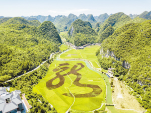 秋高气爽时节,贵州省安顺市龙宫镇稻田陆续成熟,静待收割。