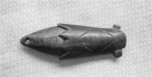 经鉴定得知,这是一枚清代用黄铜制作的蝉形针囊,长约5厘米,宽约2厘米,厚约1厘米,重约15克。该针囊因为使用时间太长,已经看不出金黄的本色,其颜色发沉,部分地方有少许铜锈。细观这枚针囊,蝉的头部双眼惟妙惟肖,像是瞪大了眼珠,竭力鸣唱;而翅羽刻画也较为传神,纹饰虽然只是寥寥几笔,却让人感觉它随时可能一跃而飞。铜蝉中部可以分离,两部分套合的中空部分,即为存放绣花针的地方,十分精巧。更为巧妙的是铜蝉尾部有一个小孔,可以串联丝线等物,使之不易脱落遗失。 (西晚)