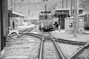 9月11日,在瑞士乌里州安德马特镇火车站,一名工作人员从停靠的列车前走过。