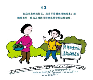预防血吸虫病,不要接触有钉螺(血吸虫病传播的中间宿主)孳生地的湖、河、塘及水渠的水体,不要在可能含有血吸虫尾蚴的水中游泳、戏水、打草、捕鱼、捞虾、洗衣、洗菜或进行其他活动。因生产、生活和防汛需要接触疫水时,要采取涂抹防护油膏、穿戴防护用品等措施。如无法避免接触疫水后,要及时到当地医院或血吸虫病防治机构进行检查或接受预防性治疗。