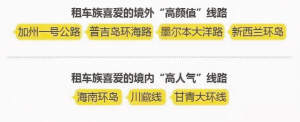 境内租车方面,川藏线以高原、山地为主,越野车最受欢迎;海南环岛自驾游等用户会根据行程安排及同游人数等因素,选择紧凑型轿车或中型SUV。