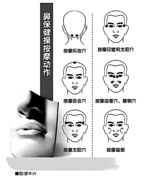 这套操共分八个动作,只要找准穴位,练起来并不难。专家建议,最好每日早晚洗漱后练习这套操,热身前要清洁双手,并搓热手掌。鼻保健操坚持做一个月以上就会看到效果,除非特殊人群,应配合药物治疗,尤其是急性期。