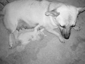 李小花讲,小猫刚送来的时候很瘦,喂养起来非常麻烦。正巧家里的母狗生了3只小狗,她就想让母狗给小猫喂奶。刚开始,母狗对小猫有些排斥,但是母狗走到哪里,小猫就跟到哪里。经过一天的亲密接触后,母狗终于接受了这只小猫。