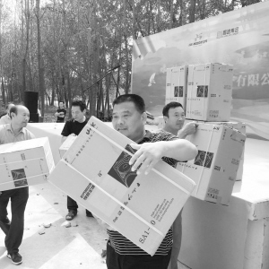 9月21日上午,周口报业昌建地产为东新区许湾办事处和搬口办事处所辖的9个行政村,捐赠了价值30万元的健身器材、音响设备等物品,助力扶贫。图为捐赠物品发放现场。