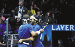 当地时间9月23日,欧洲队球员费德勒(右)/纳达尔庆祝比赛胜利。他们在双打比赛中以2∶1战胜世界队选手索克/奎里。当日,在捷克首都布拉格进行的首届拉沃尔杯网球赛进入第二日的赛程。新华社发