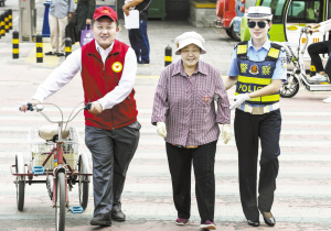 9月25日,河北省大厂回族自治县的志愿者和交警在路口帮助市民过马路。