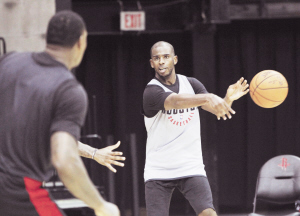 当地时间9月26日,火箭队球员保罗(右)在训练中传球。当日,NBA休斯敦火箭队举办新赛季训练营。