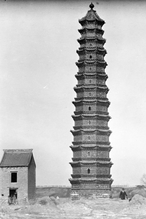 铁塔始建于公元1049年(北宋皇祐元年),是1961年中国首批公布的国家重点保护文物之一,素有“天下第一塔”之称。铁塔高55.88米,八角13层,因此地曾为开宝寺,又称“开宝寺塔”。又因其遍体通彻褐色琉璃砖,混似铁铸,从元代起民间称其为“铁塔” ,在900多年中,历经了37次地震,18次大风,15次水患,而巍然屹立。