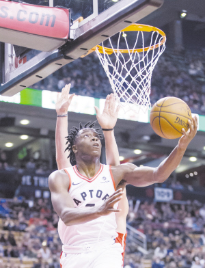 当地时间10月10日,猛龙队球员阿努诺比(前)在比赛中上篮。当日,在2017~2018赛季NBA季前赛中,多伦多猛龙队主场以116∶94战胜底特律活塞队。 新华社发