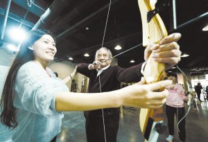 10月12日,表演艺术家杨在葆在全国业余射箭冠军获得者王婉(左)指导下体验射箭。近年来,随着全民健身的蓬勃开展,过去属于冷门的射箭运动开始在北京悄然升温。由于该项运动集休闲和健身于一身,受年龄和身体素质的限制较小,因而受到大众的喜爱。据北京市射箭协会有关专家介绍,目前北京拥有各种规模的箭馆、射箭俱乐部20多家,热衷该项运动的人群数以万计。