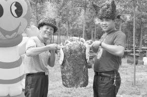 去年,杨国平在北京农业嘉年华建了蜜蜂馆。“蜂衣表演”一亮相,立刻引起游客的浓厚兴趣。许多人见到蜜蜂躲着怕被蜇,而在这里,成群的蜜蜂不但趴在人的身上,而且还有模有样地聚集成帽子、衬衣、围裙等造型。蜜蜂为啥会“自觉”组成造型?杨国平说,蜜蜂的天性是跟着蜂王。为了让蜜蜂按照预先设计的造型聚集在一起,他用从蜂王身上提取的特殊物质做成造型,吸引蜜蜂成群赶来。至于蜜蜂为啥不蜇人?杨国平讲,他根据蜜蜂的生活习性研制出一种特殊物质,让蜜蜂感觉没有受到外界攻击而变得“温顺”起来,因而不会轻易向人发出攻击。