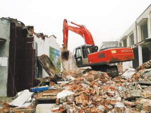 本报讯 10月16日上午,川汇区棚户区改造第六分指挥部对金海路办事处彭新庄部分房屋进行拆除(上图)。周口晚报记者在现场看到,该区采用湿法拆除法,确保拆除过程没有扬尘。与此同时,大型建材粉碎再生机械抵达现场候命,拆除之后的建筑垃圾通过这种机械粉碎,还可以再次利用。