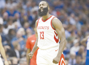 当地时间10月18日,火箭队球员哈登在比赛中。当日,在2017~2018赛季NBA联赛常规赛中,休斯敦火箭队客场以105∶100战胜萨克拉门托国王队。