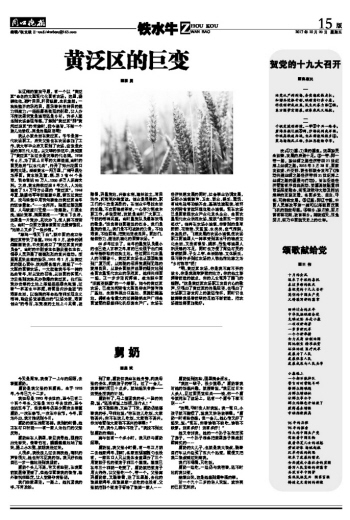 我从小就生活在黄泛区。爷爷是第一代农场职工,后来父亲也在农场参加了工作,我大学毕业后又回到了农场,应该是农场的第三代人啦。从父辈的讲述中,我知道了“黄泛区”在过去是灾难的代名词。1938年6月,为了阻止日军的大肆进犯,当时的国民政府“以水代兵”,炸开了郑州花园口黄河大堤。滔滔黄水一泻万里,广阔平原沦为泽国。黄水殃及豫、皖、苏3省44个县市,丧命者近90万人,1200多万人流离失所。之后,黄水持续泛滥8年之久,人为地造成了5.4万平方公里的“黄泛区”。1948年夏,陈毅将军率部逐鹿中原,曾五过黄泛区,戎马倥偬中用诗句描绘出黄泛区当年的悲惨景象:“……水茫茫。陷泥过膝及腰腹,人马欲渡川无梁……走踉跄。川原水洗,城社荒落,满园凄凉……”黄水下去后,这里是一片荒沙,风吹沙飞,使人辨不清南北。当时一位西方预言家面对此景曾慨叹:“地球上又多了一块沙漠。”