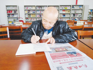 10月19日上午,在市图书馆阅览室,85岁的郑祥瑞老人正认真阅读《周口晚报》上刊登的十九大开幕会内容。经了解,老人是周口市中心城区周边农民,1960年入党。郑祥瑞说,他没事就来图书馆看书读报,今天专门带个笔记本,把报告要点记录下来,回去给乡亲们讲讲。