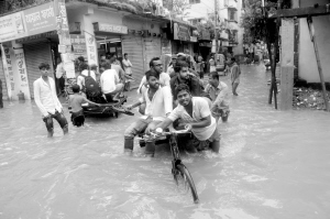 10月21日,在孟加拉国首都达卡,当地居民在积水中穿行。