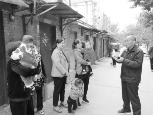 10月22日,川汇区荷花路办事处退伍老党员马绍领、退休老党员王玉岭等人胸前佩戴党徽,分别在电厂家属院、前王营社区,向大家宣传党的十九大精神。图为马绍领(右一)在电厂家属院向大家宣传党的十九大精神。晚报记者 徐松 通讯员 夏长中 摄