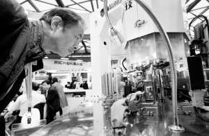 10月25日,参观者在观察一台芯片测试包装一体机的作业演示。
