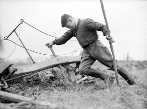 太阳已经老高了,我们才披挂上阵。可刚一进地,那牛就又踢又蹦不入套,套绳和牛梭子一次次往牛脖子上挂了又滑下。好不容易上套了它又不识套,你刚一松牛鼻圈它就猛蹿几步,不是套绳缠牛蹄子了,就是犁铧不入地,哧溜——滑了很远,又得吆喝着拽回去重犁。几个回合下来,还没干活儿我就已经满头大汗。
