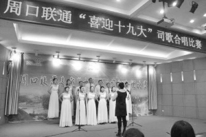 周口联通举办“喜迎十九大”中国联通司歌比赛,来自各县(市)、各部门共12支参赛队伍激情放歌,用他们嘹亮的歌声庆祝党的十九大胜利召开。各参赛队统一着装,用形式多样的方式演绎《联通之歌》,有领唱、伴唱,有声情并茂的诗歌朗诵,大家情真意切,歌声铿锵有力,用音符表达了对美好前景的祝福。通讯员 刘伟 摄