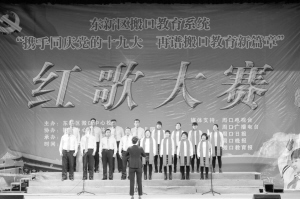 10月29日上午,东新区搬口办事处组织近300名师生进行红歌大赛。他们用嘹亮的歌声和优美的舞蹈展现了昂扬斗志。图为比赛现场。晚报记者 王凯 摄