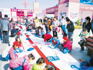 ▲周口晚报小记者“百双小手共绘百米长卷”
