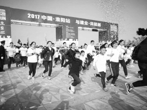 本报讯 建业城市健跑——淮阳站于10月28日上午在龙湖岸边鸣枪开跑,来自周口区域的业主、建业集团各大服务体系、马拉松爱好者、社会团体、商家代表、媒体等近万人共同参与了此次活动。